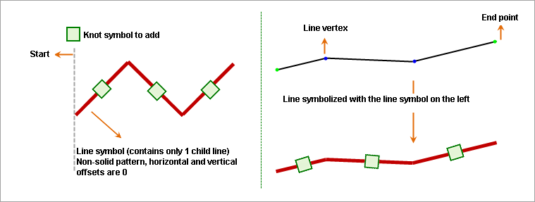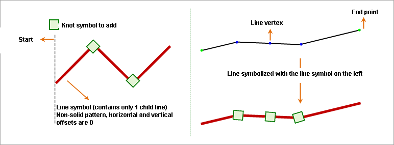 Adding an end symbol to a subline allows you to place specified symbols at special positions on the subline. These positions include: head of the subline, tail of the subline, middle point of the subline, segment center of the subline, and polyline center of the subline. The effects of adding end symbols are further explained through diagrams below.