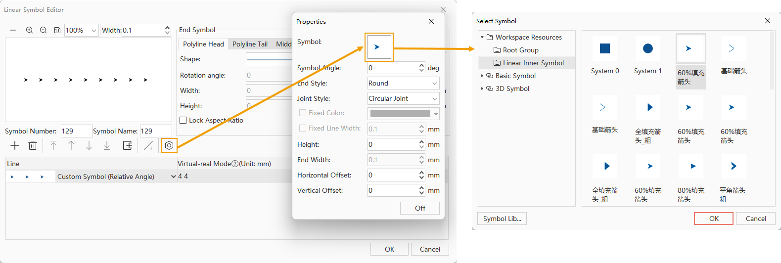Additionally, sublines can be composed of specific symbols. As shown in the figure below, the subline type is a symbol subline, meaning it consists of symbols. The virtual-real mode of the subline (for details on virtual-real mode, refer to the section below on virtual-real mode) can adjust how symbols are distributed in the subline, such as the spacing between symbols. To set the subline type as a symbol subline, select the Custom Symbols type from the subline type list.