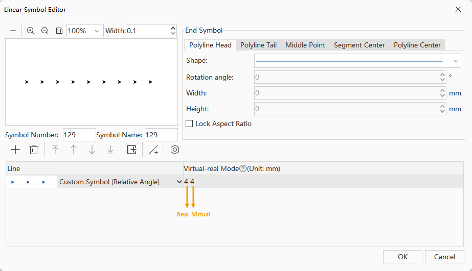 When the subline type is set to symbol subline, you can further specify the symbols that constitute the subline and adjust its virtual-real mode.