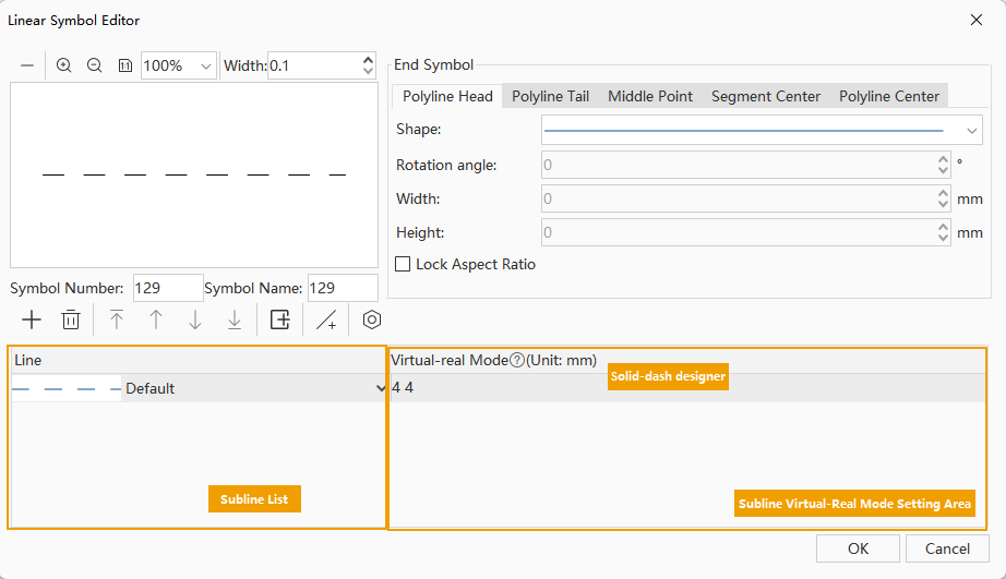 By setting the virtual-real mode, sublines can achieve an alternating solid and dash drawing effect. For detailed information about the virtual-real mode for sublines, please refer to the Virtual-Real Mode for Sublines section in Composition of 2D Line Symbols. The following mainly introduces how to implement the virtual-real mode drawing for sublines in the linear symbol editor.