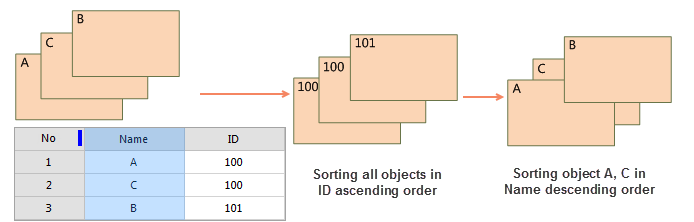 As shown in the following figure: Adjust the Display Order of A, B and C objects, sort them in ascending order for the first time according to the ID field, and then sort them in descending order according to the second field Name to get the results as shown in the following figure.