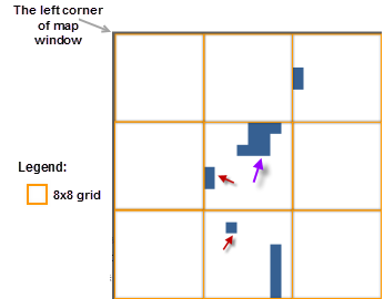 If the Tolerance Settings of the overlapped small object is 8 pixels, the object with the length and width of Bounds less than 8 pixels participates in the filtering; the designated unit pixel area is a square area with a side length of 8 pixels, and the starting point of the unit pixel area is the Uppe-left corner of the window point of the map. As shown in fig. 3, based on the set unit pixel area, the Map is divided into regular grids, taking the drawing of the object in the second row and second column area in the figure as an example, assuming that the object marked by the purple arrow precedes the Object Drawing marked by the red arrow, when the object pointed by the purple arrow is drawn, it is judged that the object is a small object, and the center point is located in the square area. And if no other small object is drawn in the square area, the small object is kept displayed, and meanwhile, the small object drawn in the area is marked; and when the object indicated by the red arrow is drawn, the object is also a small object, the center point is in the square area, but the area is marked with a small Object Drawing, so the object is not displayed.