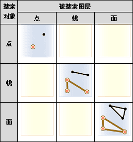 包含空间查询模式。返回被搜索图层中完全被搜索对象包含的对象。注:搜索对象和被搜索对象的边界交集可以不为空;点查线/点查面/线查面,不存在包含情况。该关系适合的对象类型: