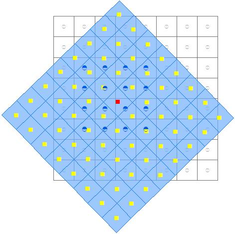 以下示意图为栅格数据经过平移和旋转的几何变换之后,输出栅格采用最邻近法重采样,其中黑色线框示意的是输入栅格,蓝色填充示意的是输出栅格,红色的点表示输出栅格某一格子的中心位置,其栅格值需要被重新计算,此处采用距离它最近的输入栅格的值。