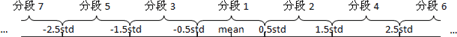 标准差分段。标准差分段方法反映了各要素的某属性值对其平均值的偏离。该方法首先计算出专题变量的平均值和标准偏差,在此基础上进行分段。标准差分段的每个分段长度都是一个标准差,最中间的那一段以平均值为中心,左边分段点和右边分段点分别与平均值相差0.5个标准差。设专题变量值的平均值为 mean,标准偏差为 std,则分段效果如图所示。