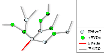 getNodes和getEdges方法返回。关键设施结点的查找方式可以归纳为:从分析弧段出发,向它的上游回溯,每个方向上遇到的第一个设施结点,就是要查找的关键设施结点。如下图所示,从分析弧段(红色)出发,查找到的关键设施结点包括:2、8、9 和 7。而结点 4 和 11 不是回溯方向上遇到的第一个设施结点,因此不是关键设施结点。作为示意,这里仅给出了分析弧段的上游部分,但注意分析结果还会给出关键设施结点 2、8、9 和 7 的下游弧段。