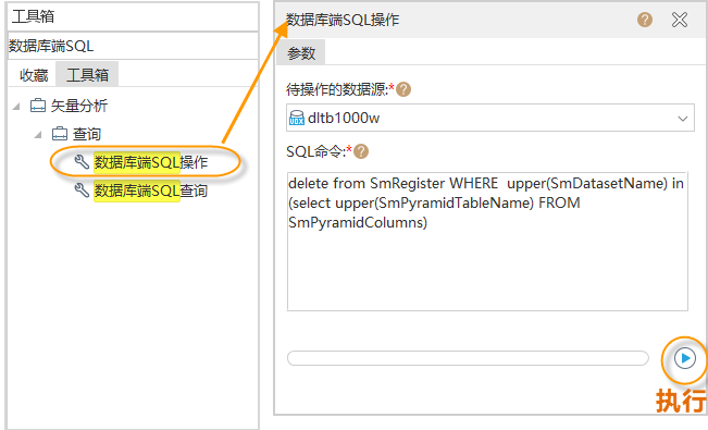在工具箱中搜索“数据库端SQL操作”工具,如下图所示,打开工具,设置参数: