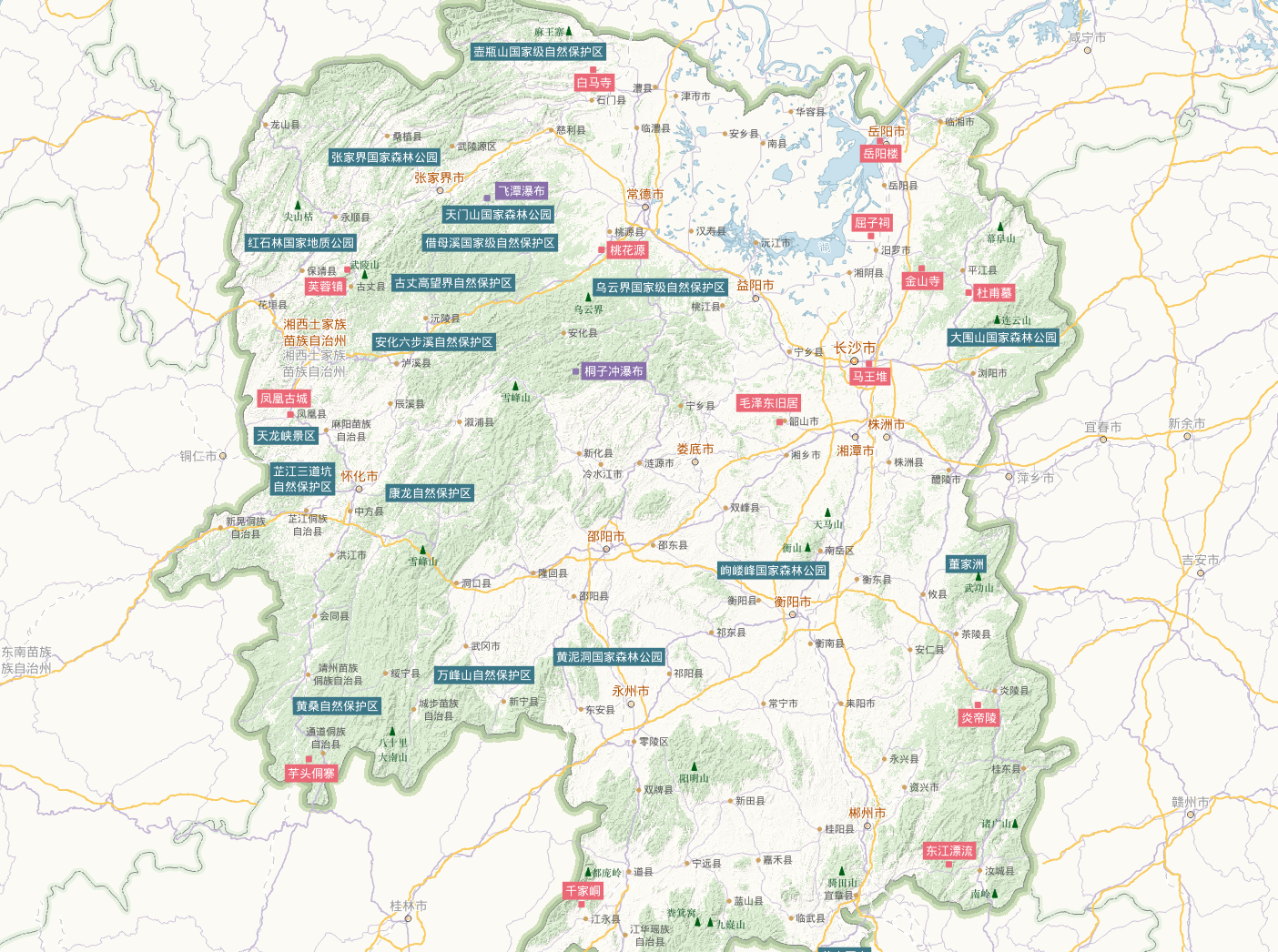 - 其他行政点图层制作标签统一专题图的方式与之类似,在此不再赘述。分别完成这些图层的标签统一专题图制作后,即可得到一幅完整的湖南省旅游资源示地图,如下所示:
