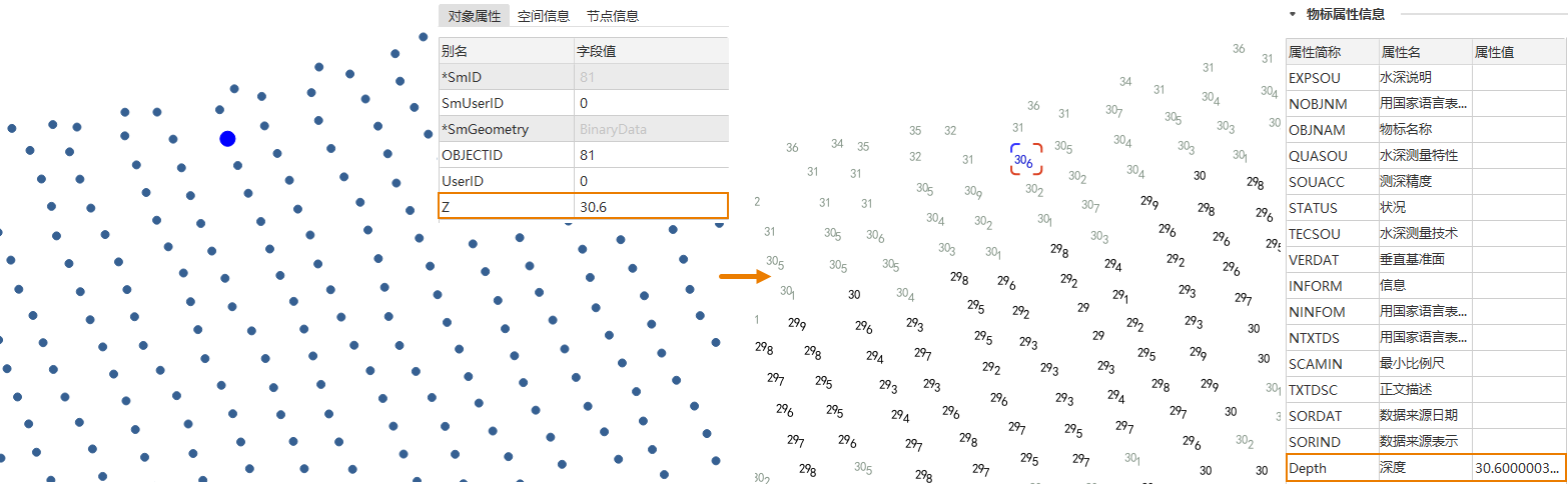 - 点击确定按钮,即可将待追加记录集的对象添加至目标数据集。在地图窗口中打开海图分组可查看追加结果。例,将点数据集追加为水深物标,追加时将点数据集中的Z字段作为水深物标的深度字段,结果如下图所示: