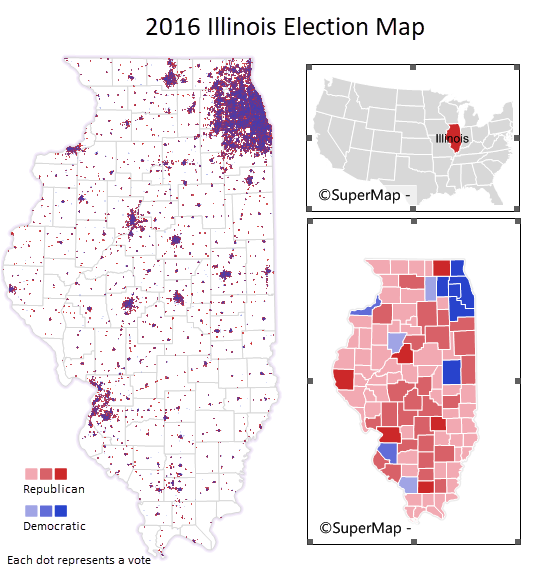 Using sample data from SampleData->ThemeMap->Illinois workspace, this example adds two inset maps (state locator map and voting district map) to the 2016 Illinois Election Map, achieving the result shown below.