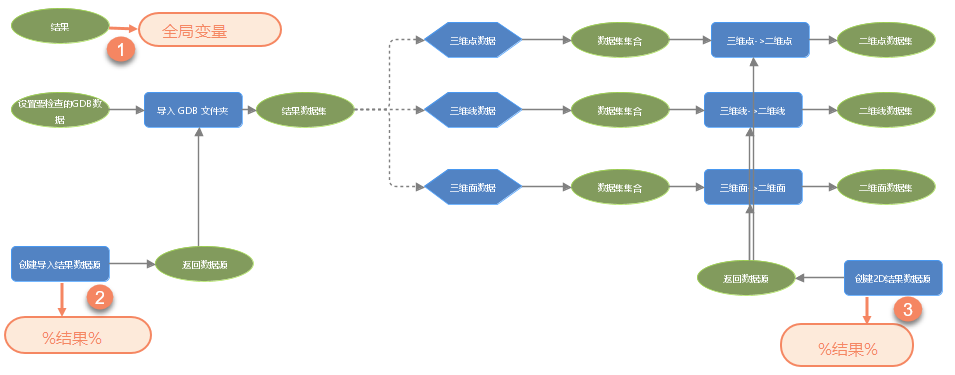 Variables are mainly used to store data in the model. When the model is too complex, variables can be added to the model as parameters for other tools to simplify the model. In the following model, it is necessary to convert gdb data into udbx data and convert the three-dimensional data in gdb data into two-dimensional data. The variable "result" in this model is a global variable, and the storage path for the "result" has been set. Afterwards, for "Create Import Result Datasource" and "Create 2D Result Datasource", inline variables are used to replace the% result%. Finally, during model operation, all running results will be replaced by inline variables. When it is necessary to modify the storage location of the running results, only the parameters of the "results" need to be modified.