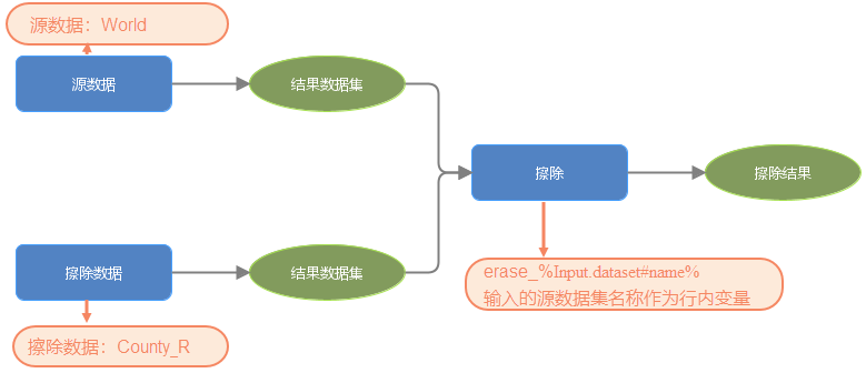 In line variable replacement supports adding strings before and after string variables to form a new string. In the following model, use inline variables to replace the naming of the Result Dataset for erasure analysis Input. dataset% refers to the source dataset, # name refers to the name, and the combination of% input. dataset # name% represents the name of the source dataset. The source dataset is named 'World', therefore, during model execution,% input. dataset # name% will be used to replace 'World', and the string '_' will be used to output the Target Dataset Name as' erase_World '.