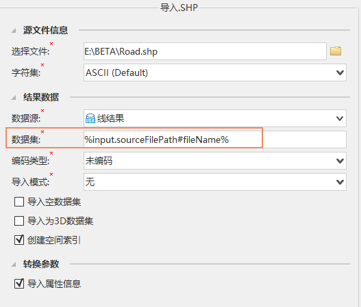 When importing shapefile files into udbx, you can choose the file name as an inline variable. In the following model, the input data path is E: BETA Road.shp, the Output Result dataset uses% input. sourceFilePath% to refer to the input path, and # fileName to refer to the file name. Therefore, during model execution, the 'Road' file name will be replaced by% input. sourceFilePath # fileName%, and the output dataset name will be 'Road'.