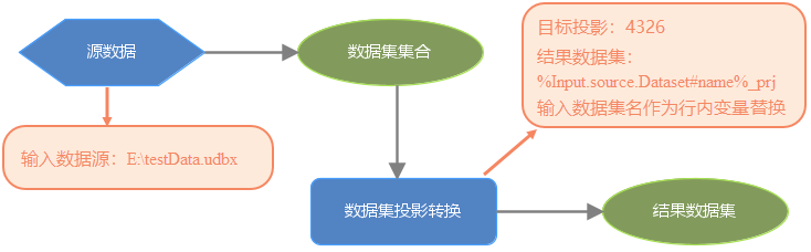 When batch processing of datasets or data files in the data source is required, "iterative datasets" or "iterative files" are usually used. The use of inline variable substitution in combination with "iterative dataset" or "iterative file" enables standardized naming of the results of batch data processing. In the following model, perform batch projection transformation on all datasets in the testData.udbx data source. When naming the Result Dataset for projection transformation, use% input. sourceDataset # name% to refer to the input dataset Name. Use the 'Iterative Dataset' tool to traverse the datasets in the udbx data source, and the result is a new dataset name composed of adding '_prj' to each input dataset name.