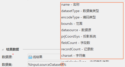 | Vector Dataset | name datasetType encodeType bounds datasource prjCoordSys fieldCount recordCount charset spatialIndexType |