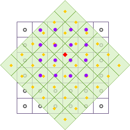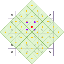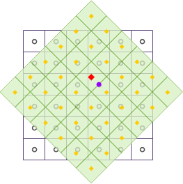 As shown in the figure above, after raster data undergoes geometric transformations such as translation and rotation, the output raster dataset is resampled using cubic. The black wireframe represents the input raster dataset, the light green fill represents the output raster dataset, and the red square point represents the center position of a specific cell in the output raster dataset, whose cell value will be updated. Take the 16 neighboring points around the red square point; the center points of these 16 neighboring points are indicated by the purple circles in the figure. By calculating their distance-weighted mean, the calculation result is filled into the red square point, completing the resampling of one raster cell.