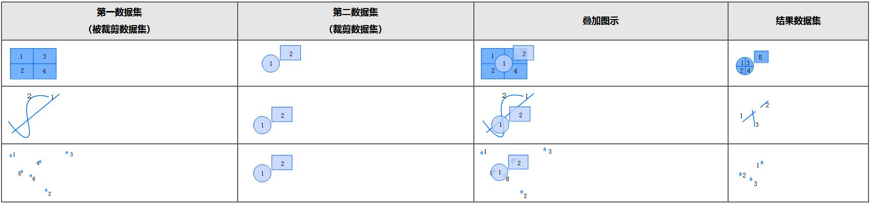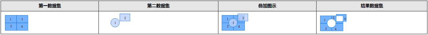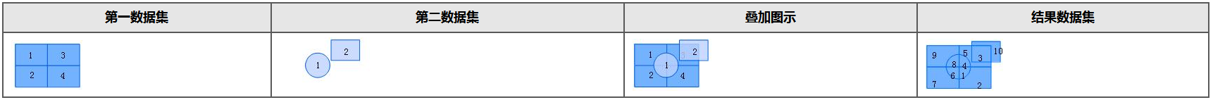 The types of stacking supported by distributed vector stacking analysis include: *Cropping: Extract a partial feature set from the cropped (stacked) dataset, and only objects that fall within the polygons of the cropped (stacked) dataset will be output to the resulting dataset. ! *Intersection: The feature objects of the intersected (superimposed) dataset are segmented at the intersection with the polygons in the intersected (superimposed) dataset (excluding point objects), and the resulting dataset retains the overlapping part of the original two datasets. ! *Erase: The erasing dataset (overlay) defines the erasing area. Any feature features that fall within these polygonal areas in the erased dataset (overlay) will be removed, while those that fall outside the polygonal area will be retained, which is the opposite of the Clip operation. ! *Consistent: The layer range of the same operation result is the same as the range of the first dataset (stacked), but contains geometric shape and attribute data from the second dataset (stacked). ! *Update: The update operation replaces the overlapping parts of the updated (superimposed) layer with the updated (superimposed) layer, resulting in the preservation of the geometric shape and attribute information of the updated dataset. ! *XOR difference: For each face object of the stacked data, remove the part that intersects with the stacked data and retain the remaining part. ! *Merge: The merged layers retain all layer features from both datasets. After the merge operation, the polygons of the two face datasets are segmented at the intersection, and the geometric and attribute information of both datasets is output to the resulting dataset. !