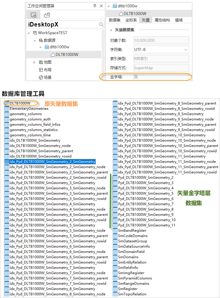 Creating a vector pyramid for a vector dataset essentially generates a series of sub-datasets with different degrees of data simplification. These datasets, as pyramid layer data, are relations of the original dataset. Therefore, in SuperMap iDesktopX (version 11.1.0), when opening a dataset with a vector pyramid, only the original vector dataset is visible; its associated pyramid layer datasets are not visible. However, in database management tools, the tables of pyramid layer datasets can be seen, as shown in the figure below.