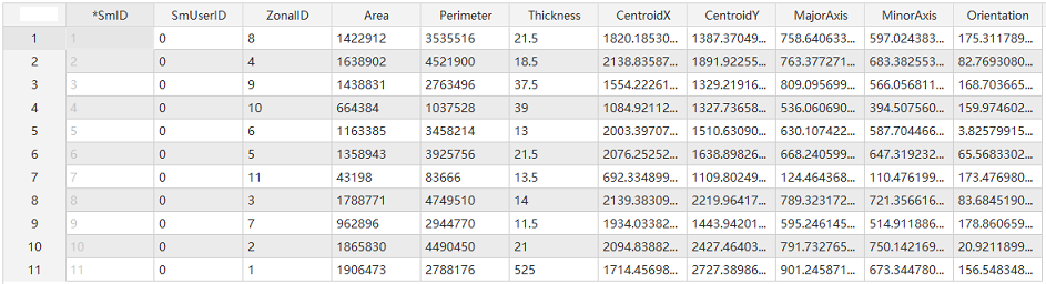 CentroidY: The Y coordinate of the centroid point. By calculating the eigenvalues and eigenvectors of each zone's shape, an ellipse is created to approximate the zone's geometry. The center of this ellipse is used as the zone's centroid.