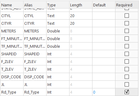 Using a road dataset (with the attribute structure shown below) as an example, this section explains how to create a subtype: