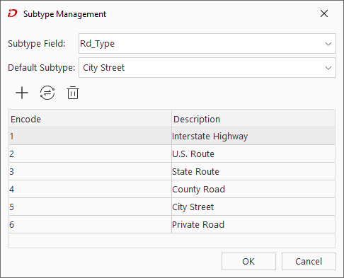 - Set the Default Subtype: After providing codes and descriptions in the subtype list, the first subtype is used as the Default Subtype by default, such as "Highway" here.