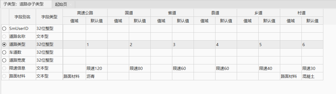 For example, the default value for the "Speed Limit Info" field managed by the "Highway" subtype is "Speed Limit 120", and the Range for the "Pavement Material" field is "Pavement Material", with a default value of "Asphalt". In contrast, the "National Road" subtype only manages the "Speed Limit Info" field, with a default value of "Speed Limit 80".