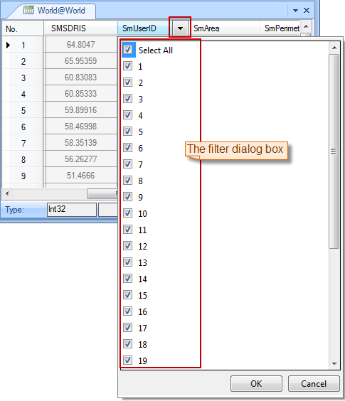 - Click the filter indicator to display a unique value list of all attribute values in that column.