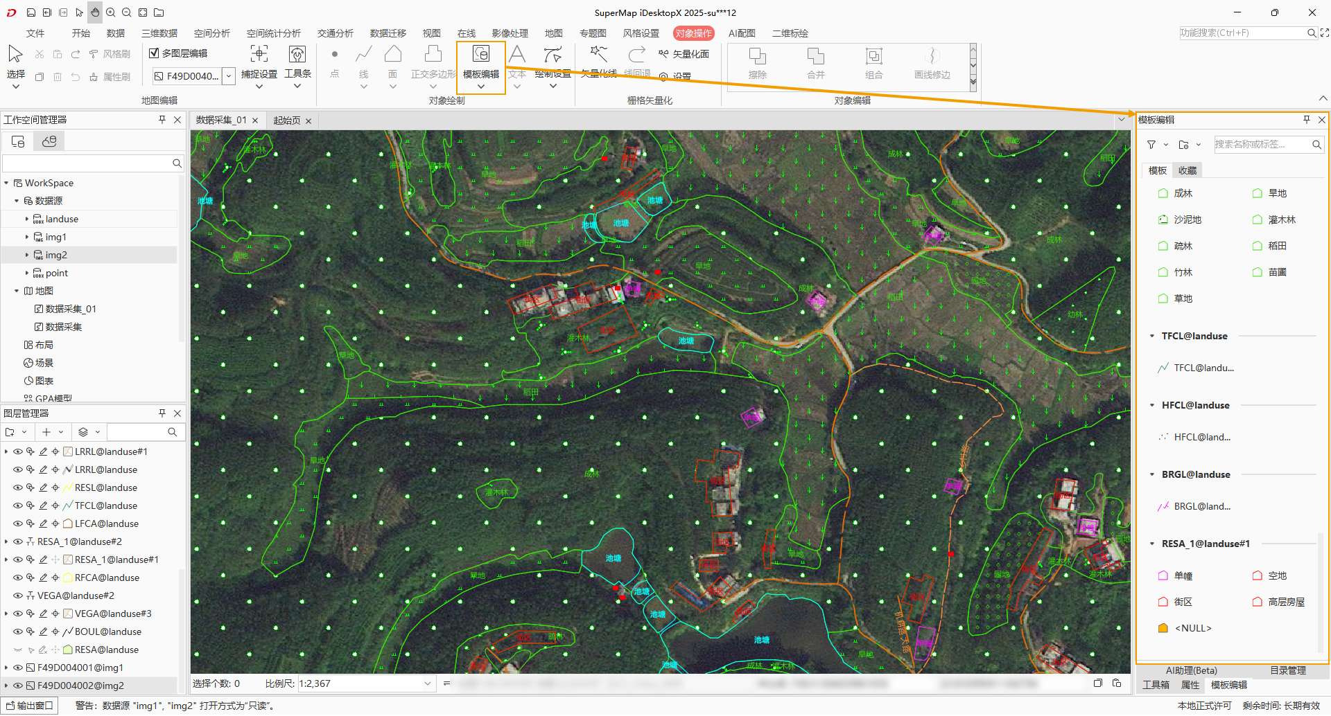 You can use template editing to update data based on the style and attributes of the current map, or when you need to batch-create geographic features that adhere to the same style standards (e.g., the same land type categories in land use data must use the same style) or standardized property fields (e.g., the code field in land use data).