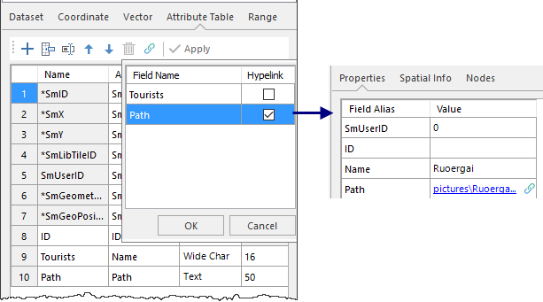Hyperlink button in the toolbar. In the pop-up list of wide character and text type fields, check the fields that need to be set as hyperlinks, click OK, and then click the Apply button in the toolbar. - Editing Hyperlink Field Values: After selecting an element in the map, the Properties panel pops up. Set the field values for this element in the panel; you can also set field values in the tabular view. If the hyperlink content is a URL, you can directly fill in the website address; if the hyperlink content is a file, you can fill in the absolute path of the file, or the relative path relative to *.udb. For example, if the image is in the img folder one level above the UDB, the relative path is written as "..\img\pic.png".