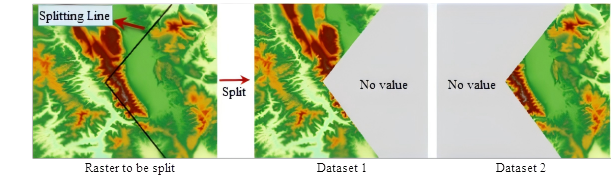 The DEM Split function splits a raster dataset into two datasets. The split line can be a straight line, polyline, polygon, etc. Left side and right side refer to the directions relative to the node sequence of the split line. Whether cells intersected by the split line are assigned to the left or right side depends on their center points' position relative to the split line.