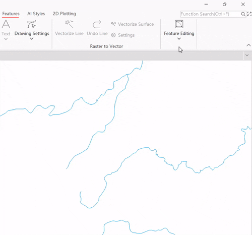 - In an editable layer, select the line object you wish to continue editing. Then, in the Gallery control of the Feature Editing group under the Features tab, click the Continue Object button in the Object Operation group. Alternatively, click the Continue Object button first; the mouse prompt in the map will display: "select a line object." Then select a line object you want to continue editing.