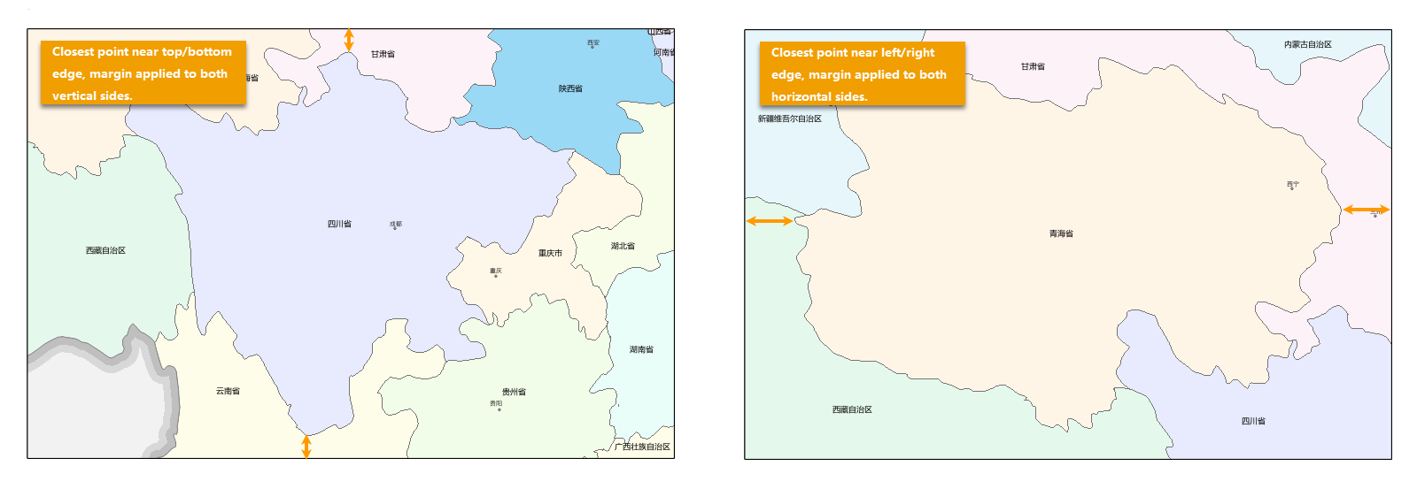 - Percent: The percentage is relative to the longest side of the minimum bounds of the index object. A margin size value of 0% means no margin, so the top and bottom or left and right edges of the object will align with the map frame, depending on the position of the closest point. A value of 100% means the margin is half the length of the longest side of the object's bounds; when the margins on both sides are added together, the result will equal the distance of the longest side of the object's bounds. The default setting is 10%.