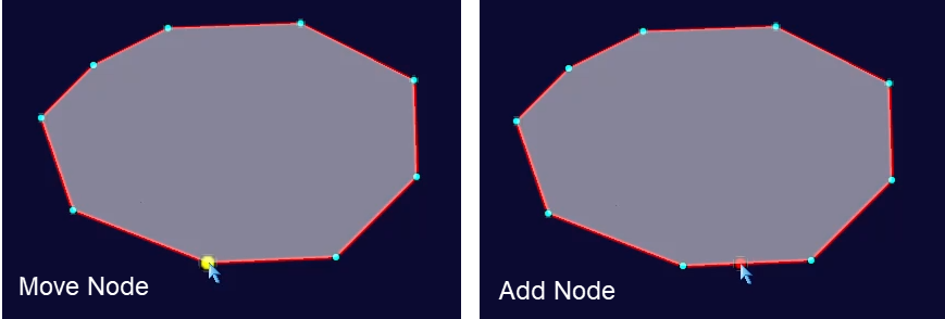 - Add Node: Click the left mouse button anywhere on the boundary line of the selected polygon object to add a new node at the clicked location.