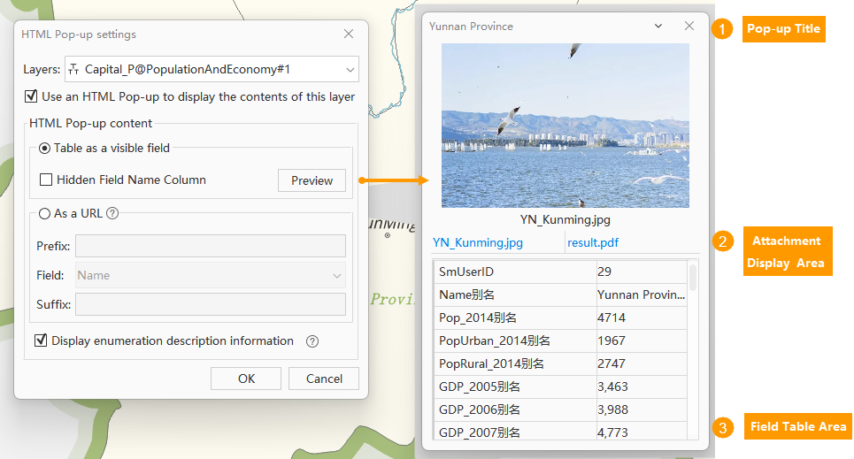 The HTML Pop-up function is an interactive tool for map viewers, used to dynamically display map details in the form of a pop-up window.