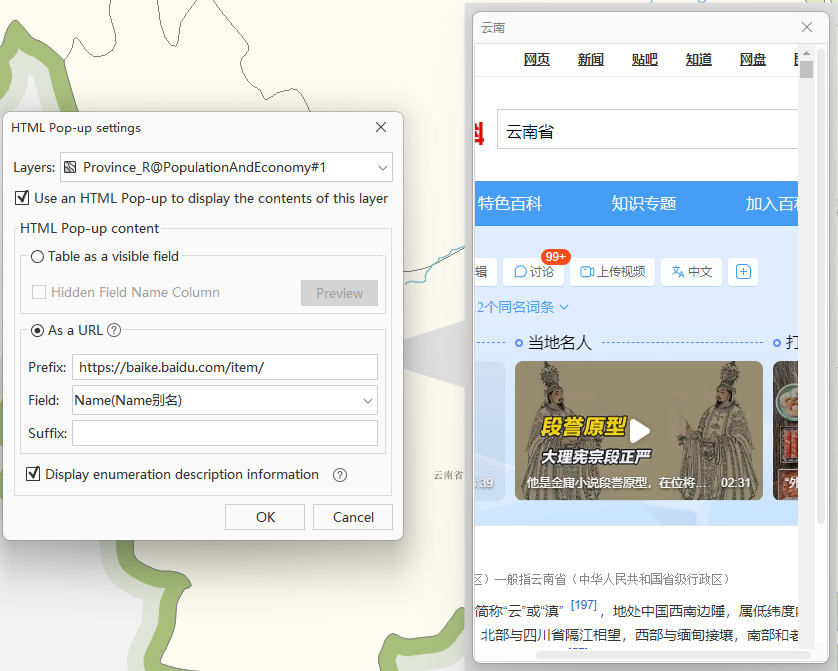 - When clicking on an object with "Name" as "Yunnan" on the map, the pop-up will act as a browser, directly loading and displaying the encyclopedia page at