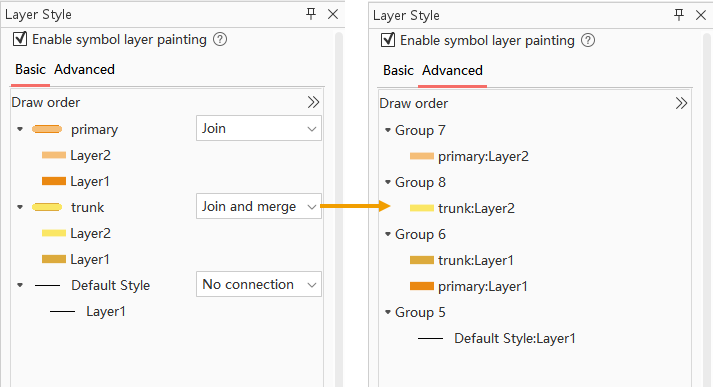 - If you adjust the draw order of symbol layers across symbol classes, or change the drawing sequence of symbol layers within a symbol class on the Advanced page, it cannot be represented in the Basic page.