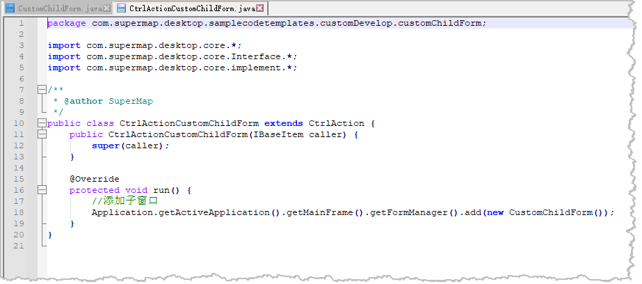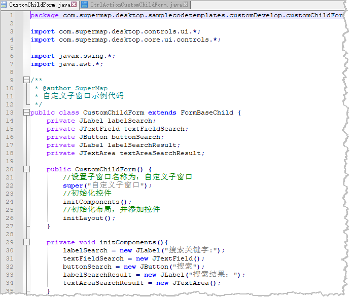 将实现子窗口代码添加至容器中,实例代码位于%产品根目录%\templates\SampleCodeTemplates\Develop\src\main\java\com\supermap\desktop\samplecodetemplates\customDevelop\CtrlActionCustomChildForm.java。代码如下图: