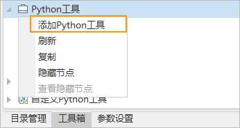 - 在SuperMap iDesktopX的工具箱面板中,右键单击Python工具项目,选择菜单中的添加Python工具。