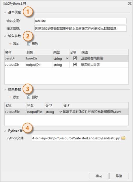 结果参数:添加一个输出参数,参数名称必须设置为“outputFile”,为该工具最终获得的一个.csv文件,该文件内容为卫星影像文件列表和元数据信息。