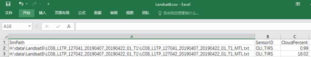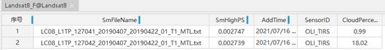结果.csv文件中记录了两幅Landsat8 卫星影像的元数据文件 _MTL.txt,最终Landsat8 卫星影像的元数据文件将添加到镶嵌数据集中,也就是说,镶嵌数据集将通过元数据文件来管理该类型的卫星影像;此外,还提取得了传感器信息(SensorID)和云覆盖量信息(CloudPercent),这两个元数据信息将添加到镶嵌数据集属性表中。