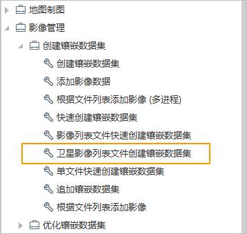 1. 在工具箱“影像管理”>“创建镶嵌数据集”节点下,双击“卫星影像列表文件创建镶嵌数据集”工具。