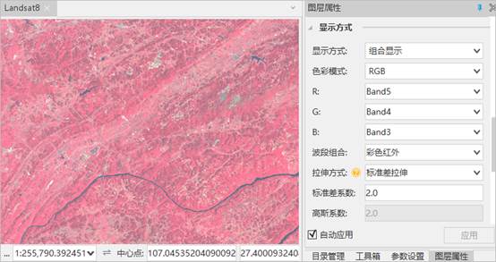 在镶嵌数据集的影像图层属性面板中,针对Landsat8卫星影像提供了几种常用的波段组合预设,可以在“波段组合”下拉列表中选择合适的组合方式,例如:下图选择了“彩色红外”,其波段组合为4,3,2,常用于区分植被、城市、水体等,其中,植被对比度更高。