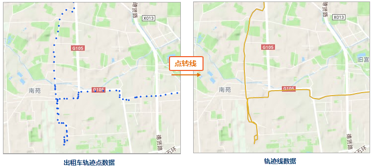 【点数据->线数据】工具可用于将带有时间字段的轨迹点数据,按照时间顺序生成轨迹线,以模拟出点数据运行的轨迹。如下图所示,将出租车轨迹点数据按照运行的时间字段作为排序字段,生成出租车行驶轨迹的线数据集。
