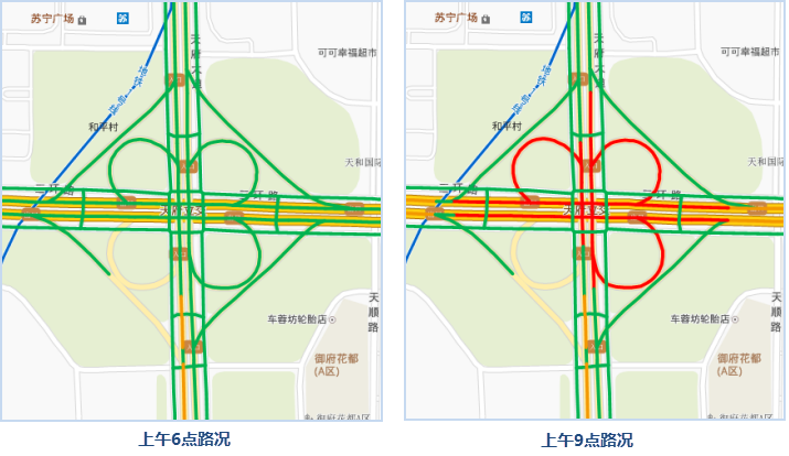 按照地图显示的比例尺级别,路况也应该分层级制图和显示,例如,大比例尺下,匝道的路况可以显示出来,而到了中比例尺下,匝道可能不显示路况;大比例尺下显示辅道的路况,小比例尺下辅道的路况不显示。
