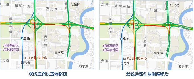 - 在“道路偏移”右侧数值框中,对表达路况专题图中的双线线型分别向两侧偏移指定距离,偏移量为正,则表示往线方向左侧偏移;偏移量为负,则表示往线方向的右侧偏移,单位为0.1毫米。通过对道路进行两侧偏移,使得小比例尺下也可以清楚地显示出双线道路的路况。