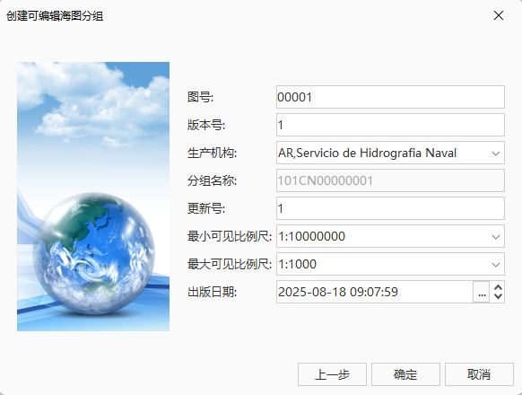 创建可编辑海图分组:第3步 - 图号:是分组名称组成的重要部分之一,可设置为五个任意字母或数字等 ASCII 码的字符。在此设置图号为 00001。