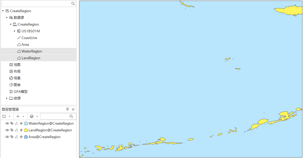 - 在 CreateRegion 数据源中导入 CoastLine.shp 海岸线数据集。