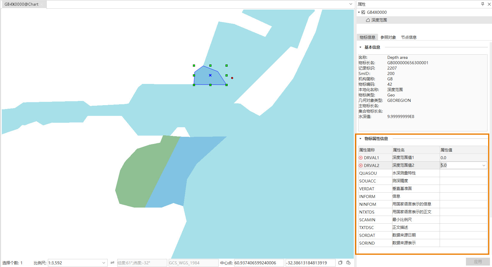 - 绘制完成后,选中该对象,右键选择属性,在物标属性信息中设置 DRVAL1 和 DRVAI2 字段的深度范围值。