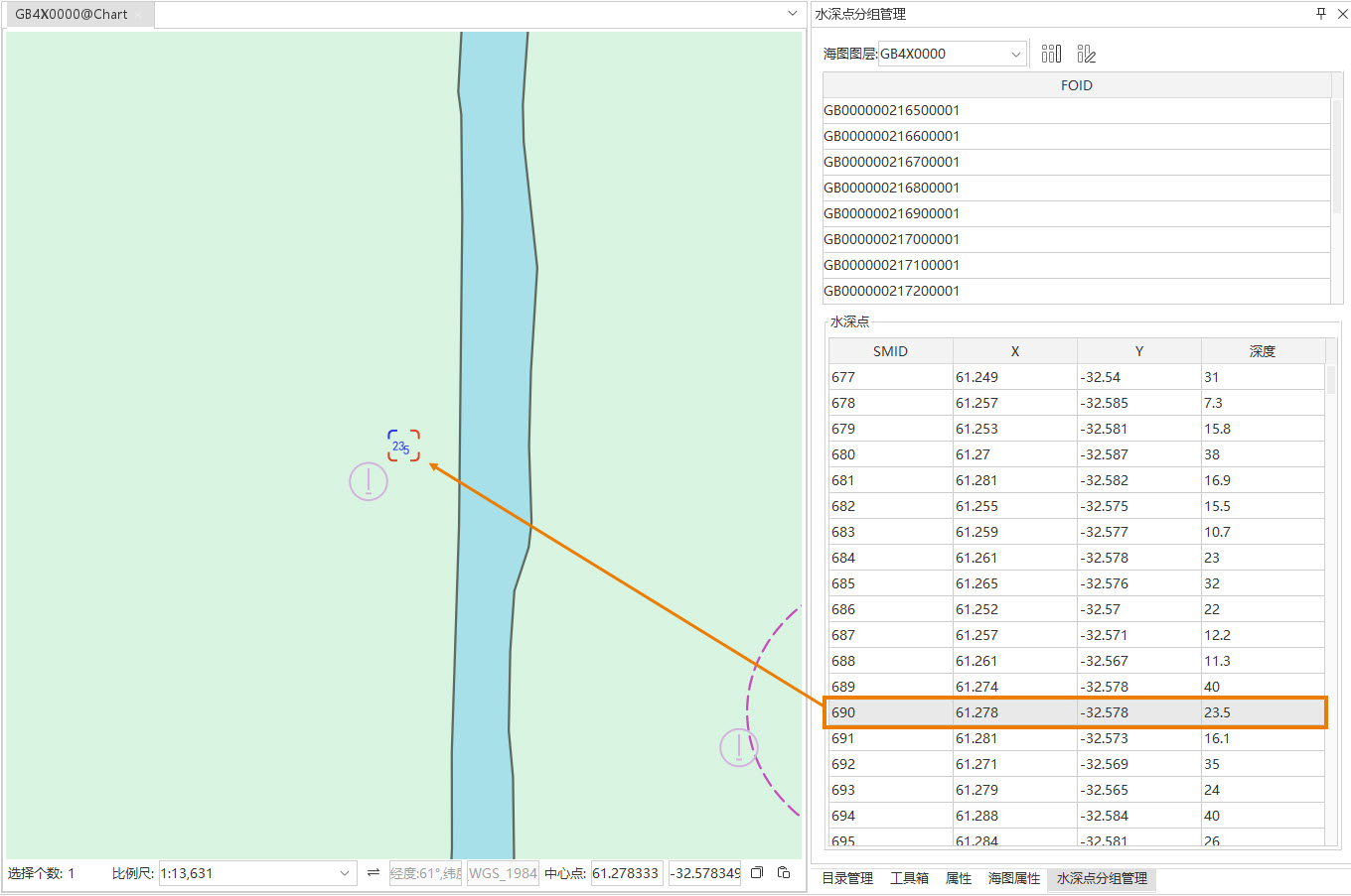 - 在水深点分组管理面板中选中某一水深分组,并在水深点列表中点击选中某个水深点。地图窗口会定位并高亮显示该水深点。