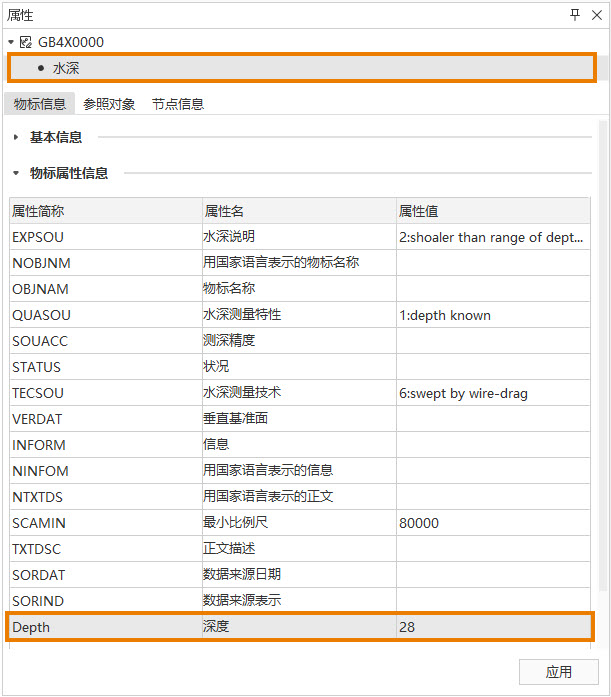 - 参考选择物标对象,在地图中选中需要修改值的水深点,在右键菜单中选择属性,界面右侧将弹出属性面板。